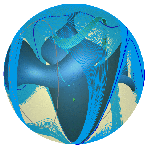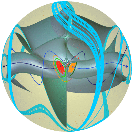 Animation with Figure 14: One isola, where the Lorenz manifold for \(\varrho = 28.0\) intersects \(S_R\) with \(R = 70.709\) from the outside coming back in, shown together with the primary intersection curves. |