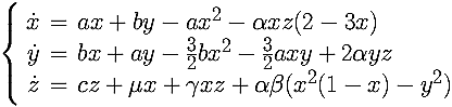 The following model is an example of a three-dimensional vector field exhibiting all types of homoclinic bifurcations. It was developed by Björn Sandstede and in a simplified form, the equations are