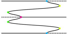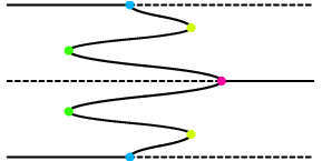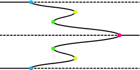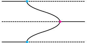 In the smooth analog of this nonsmooth codimension-2 bifurcation point two supercritical pitchfork bifurcations that occur in the order as shown in Figure 14 (left), change order without changing from supercritical to subcritical. As shown in Figure 14 (right), this means that we necessarily need extra curves of saddle-node bifurcations.
