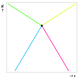The unfolding of the nonsmooth codimension-2 bifurcation point is surprisingly simple in contrast; see Figure 17. All curves are now nonsmooth bifurcations and the qualitative behavior in three of the four regions is depicted in Figure 18.