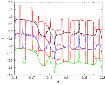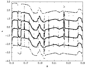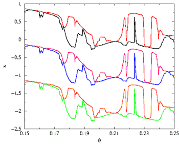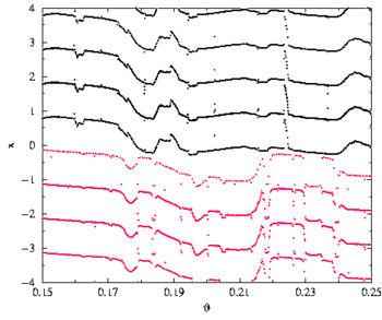 In the two-sided nonsmooth saddle-node bifurcation the attractor collides both with the repellor immediately above and below it. This leads to bidirectional diffusive motion as shown in Figure 10.
