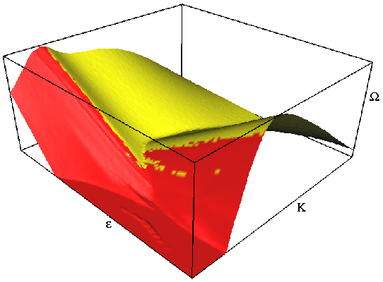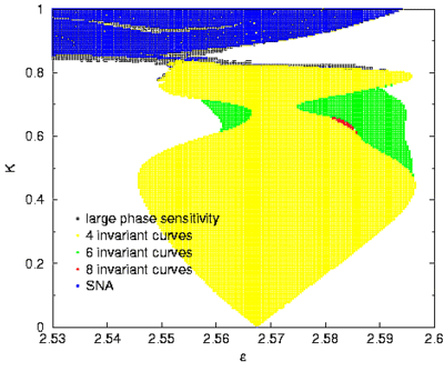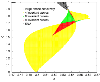 We find the nonsmooth saddle-node bifurcations on the boundary of the phase-locked region. The two-sided nonsmooth saddle-node bifurcation is the transition from the white region to the blue region in Figure 11 (left).