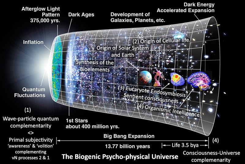 • Biocosmology: Conscious life is a climax condition of cosmology, given the form of cosmic symmetry-breaking and the fractal non-linear dynamics of molecular interaction.