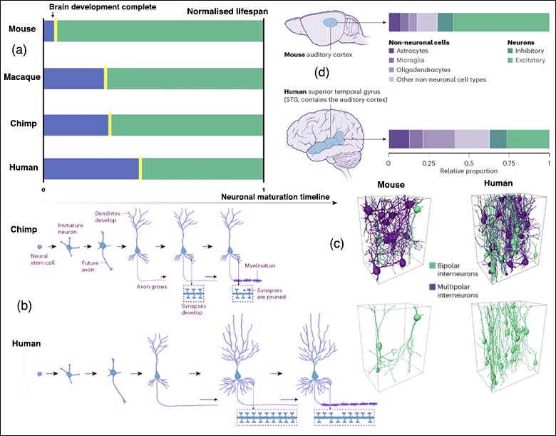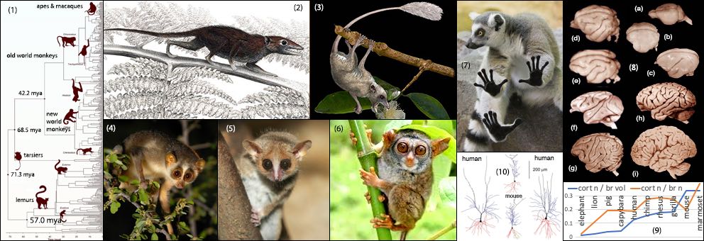 Fig 112: (left) Increase in the ratio of noncoding DNA to total genomic DNA correlates with increasing biological complexity from 0.05 in Nanoarchaeum to 0.983 in Homo. Archaea in yellow, bacteria in blue, unicellular eukaryotes in black, the fungus Neurospora crassa in light grey, plants in green, non-chordate invertebrates in red, the urochordate Ciona intestinalis in yellow, and vertebrates in dark grey. It is key to understanding how higher organisms, through to ourselves, were able to evolve, because single base pair mutations of non-coding DNA are less disruptive, as they don't have to be translated and make only a differential change to RNA and promoter binding. Complementing this, natural and particularly sexual selection is both phenotypic and conscious (Taft & Mattick 2003). This means that humans have only 2.82 times the coding genome of the amoeboid slime mould Distyostellium discoideum and 2.7 times as many genes, with only 2.0 and 1.57 as many compared with the simple roundworm Caenorhabditis elegans. Evolution has thus become a symphony on largely the same genes, as is also made clear in the great gene diversification 3 bya ago in fig 128 . (Right) The deep homology of evolutionary development displays unexpected selection pathways that also stand as the proof of principle of evolution’s creativity. Mammal hairs, each of which have sensory projections to the brain, appear to have evolved from adapted reptilian proto-feathers (Yang et al. 2019) used around the mouth for sensory sensitivity as shown in the pterosaur, resulting in mammalian whiskers as in the cat and mouse, with brain structures exemplified in rodent sensory barrels (inset) resulting in co-evolution with the brain. These then appear to have spread to the bodies of most mammals as hairs. The more advanced, smaller therapsids could have had a combination of hair and scutes, a combination still found in some modern mammals. Reptilian therapsid scutes as shown on the alligators foot (top right) have also been retained in some mammals such as the armadillo (Superina & Loughry 2012). By contrast, Pangolin scales appear to have evolved from hair (Choo et al. 2016)