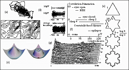 Figure 1: (a) Trajectory of a chaotic EEG recording. (b) Spatially-coherent chaotic wave patterns on olfactory bulb distinguish an odour (c) Stages of chaotic olfactory excitation. (d) Phase decoherence in novel or unexpected stimuli. (e) A fractal reproduces itself on successively smaller scales. (f) Correlation dimensions of a variety of brain states. (g) Time evolving EEG with broad frequency spectrum and associated dimensions.