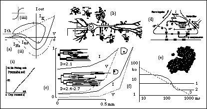 Figure 2: Non-linear and fractal aspects of the neuron. (a) Although depolarizing current causes a linear increase in firing rate (i), both (ii) formation of a limit cycle at excitation threshold and (iii) sigmoid neuron-neuron excitation curve are non-linear. (b) Anatomical complexity of the neuron. (c) Fractal dimensions of dendrites of two cell types and their electrodynamics. (d) Synaptic conduction involves many feedbacks. (e) Large molecules such as proteins are structurally and dynamically fractals. (f) Kinetics of a voltage gated K+-channel [3] is consistent with a fractal model, rather then a stochastic one [1,2].