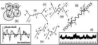 Figure 3: (a) Trajectory of an electron passing through a molecular medium illustrates quantum chaos in transmission times (b). (c) Two Feynman diagrams for the repulsion of two electrons. (d) A transaction consists of offer and confirmation waves interfering to form a single particle. (e) Time-reversed electron scattering is the same as anti-electron creation-annihilation. (f) Quantum sensitivity of frog rod cells to single photons illustrated in output recordings showing response to an average of one photon per second.