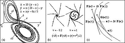 The hall-mark of a chaotic flow is sensitive dependence on initial conditions (Schuster 1986). Points which are arbitrarily close initially become exponentially further apart with increasing time, leading to the amplification of very small perturbations into global uncertainties. Sensitivity results in both an entropy increase associated with the loss of positional information with time, and in structural instability in which an arbitrarily small perturbation of the flow causes structural changes to the topology of the orbits ( although they may have similar qualitative behavior ). This prevents accurate long-term numerical approximation of the system with increasing time. In fig 1(a) sensitive dependence is illustrated. Neighboring trajectories emanating from a are visibly separate by b and diverge into distinct spirals by c1 and c2, so that their subsequent dynamics is unrelated. Note that each orbit has a unique winding sequence e.g. 1, 6, 3, 4, ... representing the number of times it negotiates each spiral arm of the attractor. An arbitrarily small perturbation will disrupt the winding sequence and hence change the topology of the orbits. The entropy results in a loss of memory of the initial conditions in any numerical approximation over time. The initial conditions thus cannot be retrieved by reverse iteration of the flow.