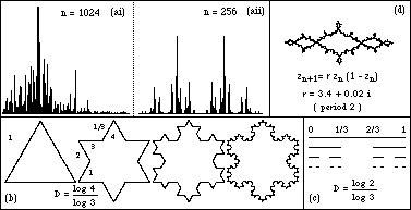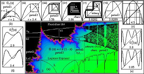 The power spectrum is one measure of the difference between chaos and quasi-periodic motion. The Liapunov exponent can also be used. In a purely stochastic process in which xn is subsequently distributed randomly across all possible values of xn+1, the Liapunov exponent will be . By contrast, in a quasi-periodic system with many periodic attractors, the Liapunov exponents should all be less than 1. For chaotic systems some of the Liapunov exponents should have positive finite values. These can be calculated indirectly as follows : We firstly use an xn+1, xn plot of a time-series to build up a profile of the transfer function xn+1 = G(xn). We then use this graph to make an empirical calculation of G'(x). Finally we can use [1.7] to get l (see fig 13(d)). Existence of chaos can also be established by demonstrating a period 3 orbit, fig 13(d) and applying the previously result that period 3 orbits imply chaos. Because the quasiperiodicity route to chaos requires only three interacting frequencies, non-linear systems with multiple frequencies have a high probability of entering a chaotic regime.