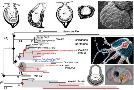 Fig 112: (left) Increase in the ratio of noncoding DNA to total genomic DNA correlates with increasing biological complexity from 0.05 in Nanoarchaeum to 0.983 in Homo. Archaea in yellow, bacteria in blue, unicellular eukaryotes in black, the fungus Neurospora crassa in light grey, plants in green, non-chordate invertebrates in red, the urochordate Ciona intestinalis in yellow, and vertebrates in dark grey. It is key to understanding how higher organisms, through to ourselves, were able to evolve, because single base pair mutations of non-coding DNA are less disruptive, as they don't have to be translated and make only a differential change to RNA and promoter binding. Complementing this, natural and particularly sexual selection is both phenotypic and conscious (Taft & Mattick 2003). This means that humans have only 2.82 times the coding genome of the amoeboid slime mould Distyostellium discoideum and 2.7 times as many genes, with only 2.0 and 1.57 as many compared with the simple roundworm Caenorhabditis elegans. Evolution has thus become a symphony on largely the same genes, as is also made clear in the great gene diversification 3 bya ago in fig 128 . (Right) The deep homology of evolutionary development displays unexpected selection pathways that also stand as the proof of principle of evolution’s creativity. Mammal hairs, each of which have sensory projections to the brain, appear to have evolved from adapted reptilian proto-feathers (Yang et al. 2019) used around the mouth for sensory sensitivity as shown in the pterosaur, resulting in mammalian whiskers as in the cat and mouse, with brain structures exemplified in rodent sensory barrels (inset) resulting in co-evolution with the brain. These then appear to have spread to the bodies of most mammals as hairs. The more advanced, smaller therapsids could have had a combination of hair and scutes, a combination still found in some modern mammals. Reptilian therapsid scutes as shown on the alligators foot (top right) have also been retained in some mammals such as the armadillo (Superina & Loughry 2012). By contrast, Pangolin scales appear to have evolved from hair (Choo et al. 2016)